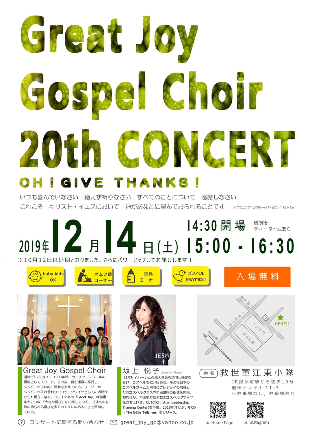 東京都墨田区で毎月第4土曜日14時30分~活動しているゴスペルサークルです。 無料体験・見学いつでも受付中~♪ great_joy_gc@yahoo.co.jp に御気軽にご連絡ください! facebookページ: https://m.facebook.com/GreatJoyGC/ Instagram: great_joy_gc