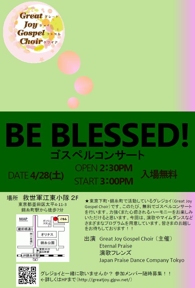 東京都墨田区で毎月第4土曜日14時30分~活動しているゴスペルサークルです。 無料体験・見学いつでも受付中~♪ great_joy_gc@yahoo.co.jp に御気軽にご連絡ください! facebookページ: https://m.facebook.com/GreatJoyGC/ Instagram: great_joy_gc