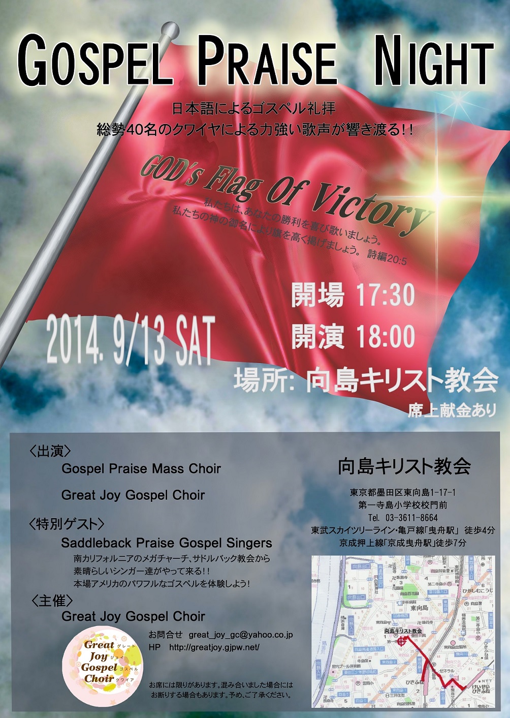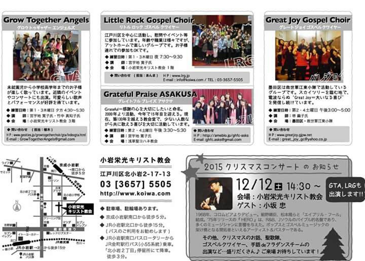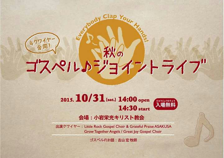 東京都墨田区で毎月第4土曜日14時30分~活動しているゴスペルサークルです。 無料体験・見学いつでも受付中~♪ great_joy_gc@yahoo.co.jp に御気軽にご連絡ください! facebookページ: https://m.facebook.com/GreatJoyGC/ Instagram: great_joy_gc