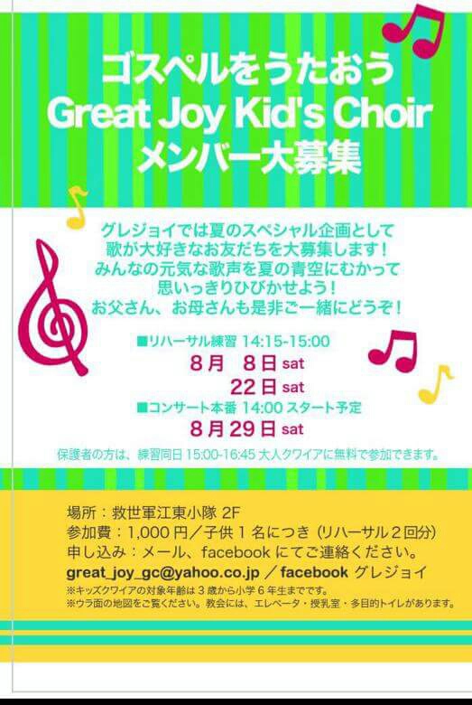グレジョイでは、8月にキッズクワイヤで一緒に歌ってくれる仲間を大募集しています!
